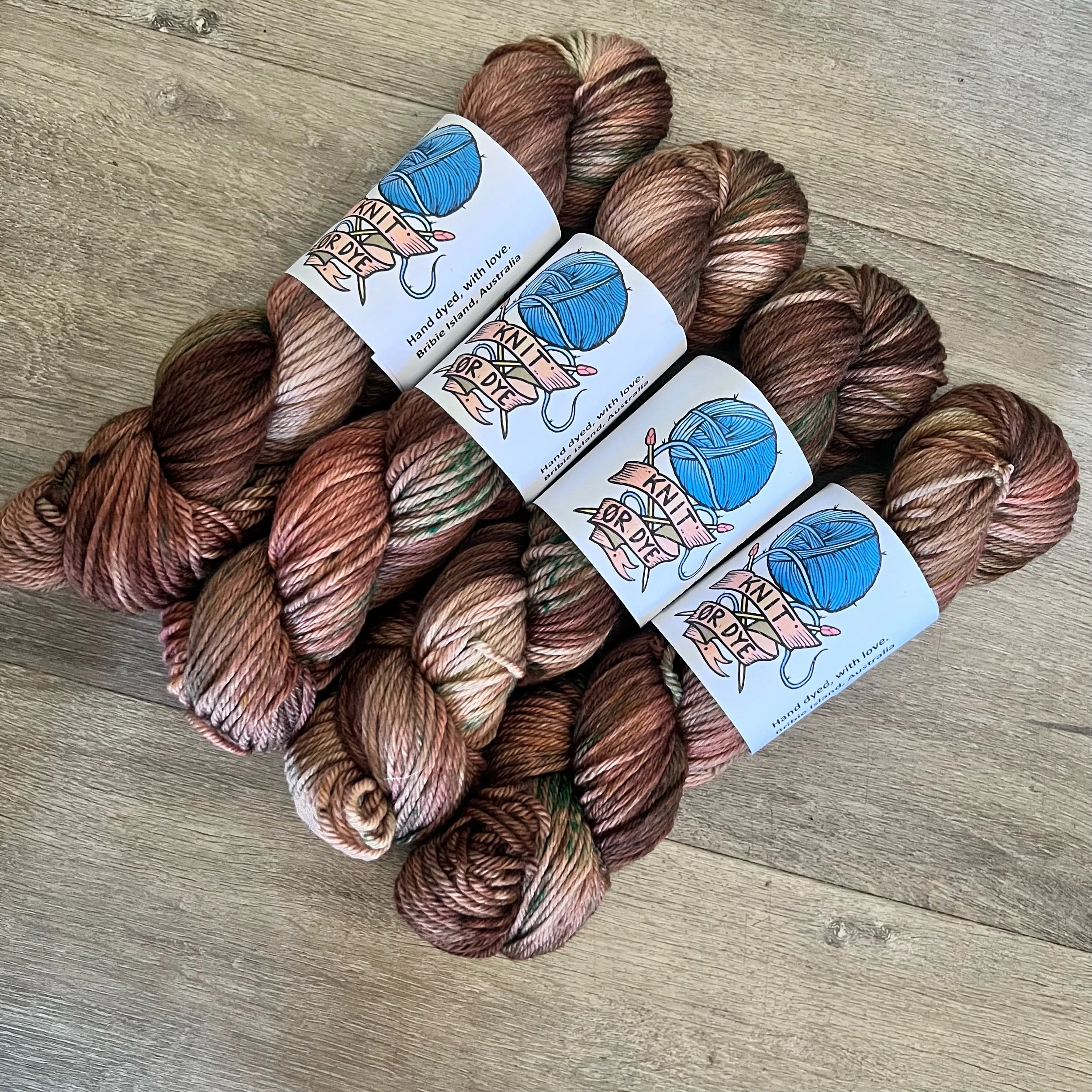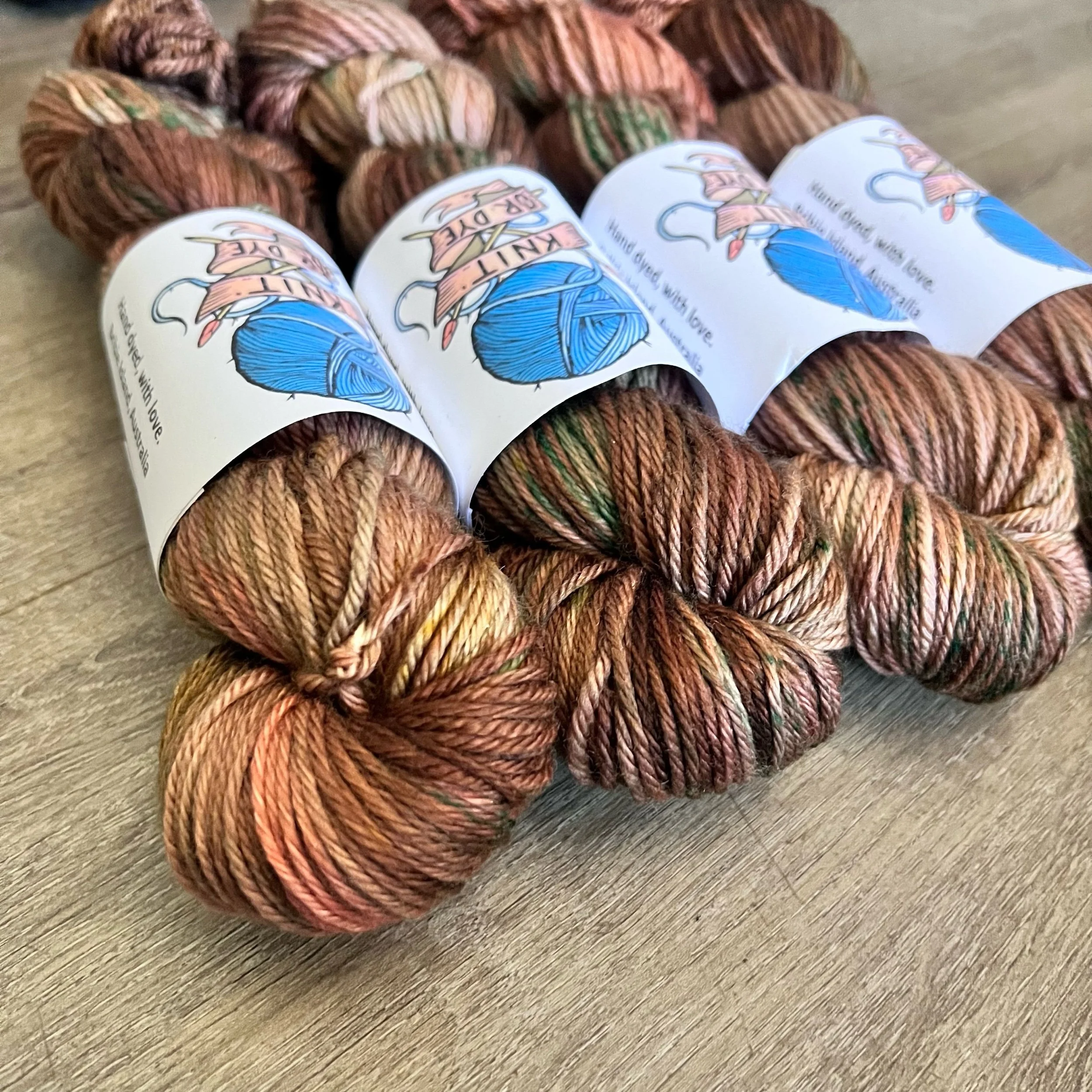 Soft, 100% superwash merino wool. Each skein is hand dyed with love ❤️. Skeins are ~ 100g, approx 180m, 8 ply (Australian weight).