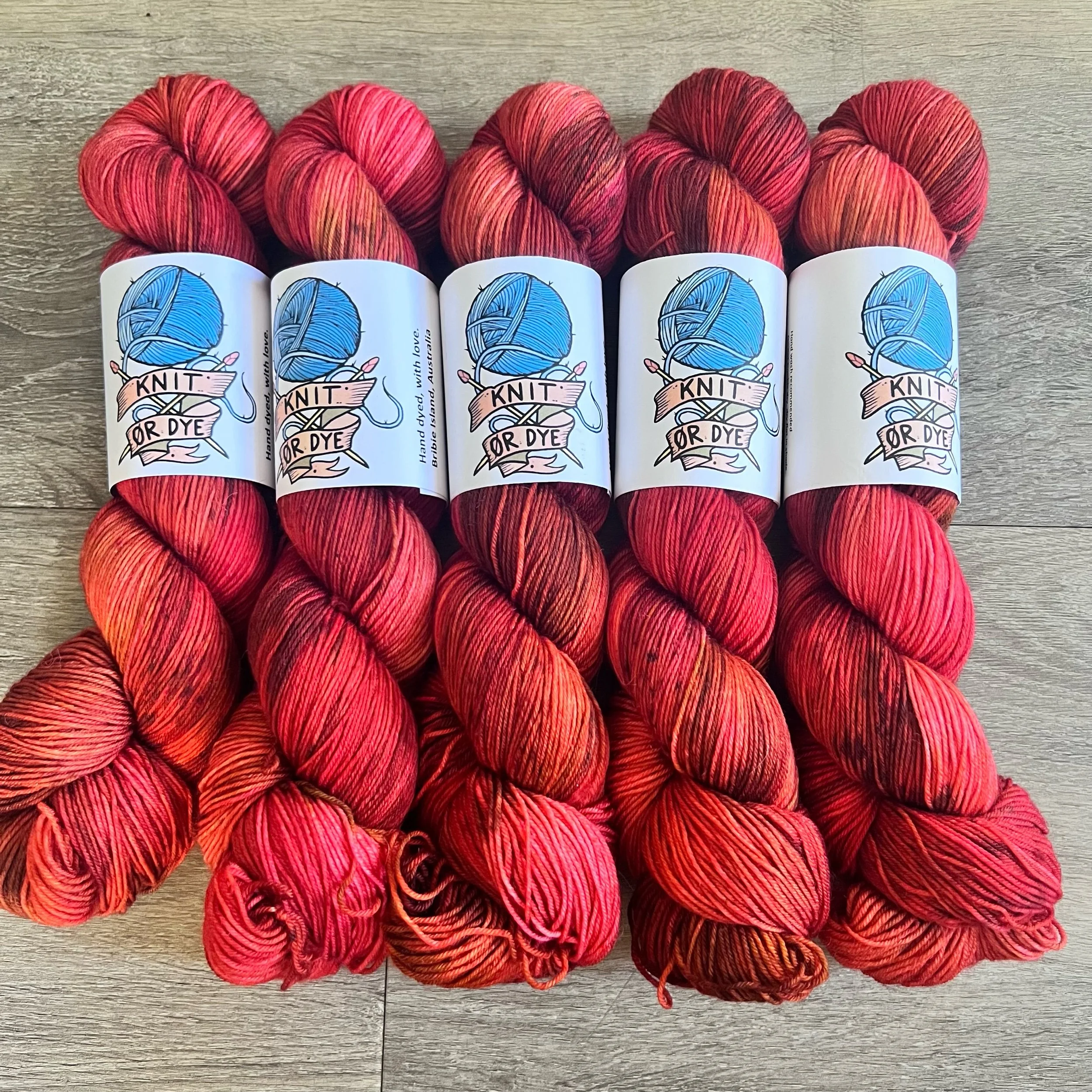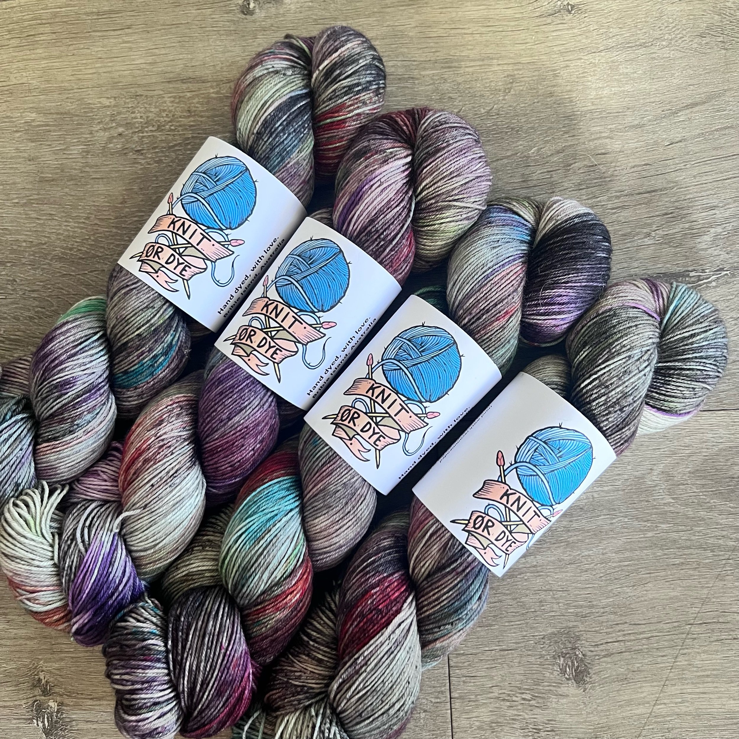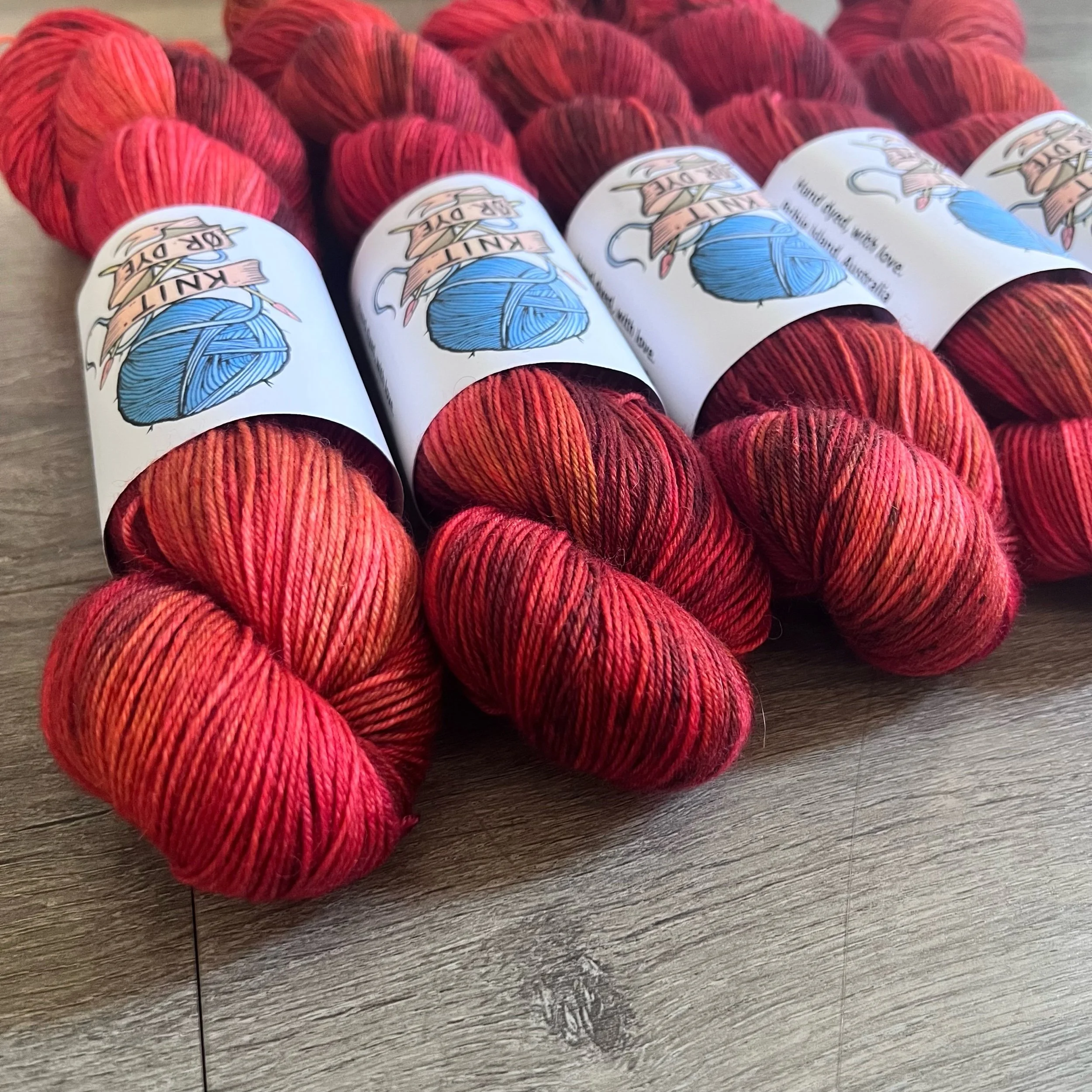 Soft, 75% superwash merino wool, 25% nylon sock yarn. Each skein is hand dyed with love ❤️. Skeins are ~ 100g, approx 425m. Fingering weight, or 4 ply (Australian weight).