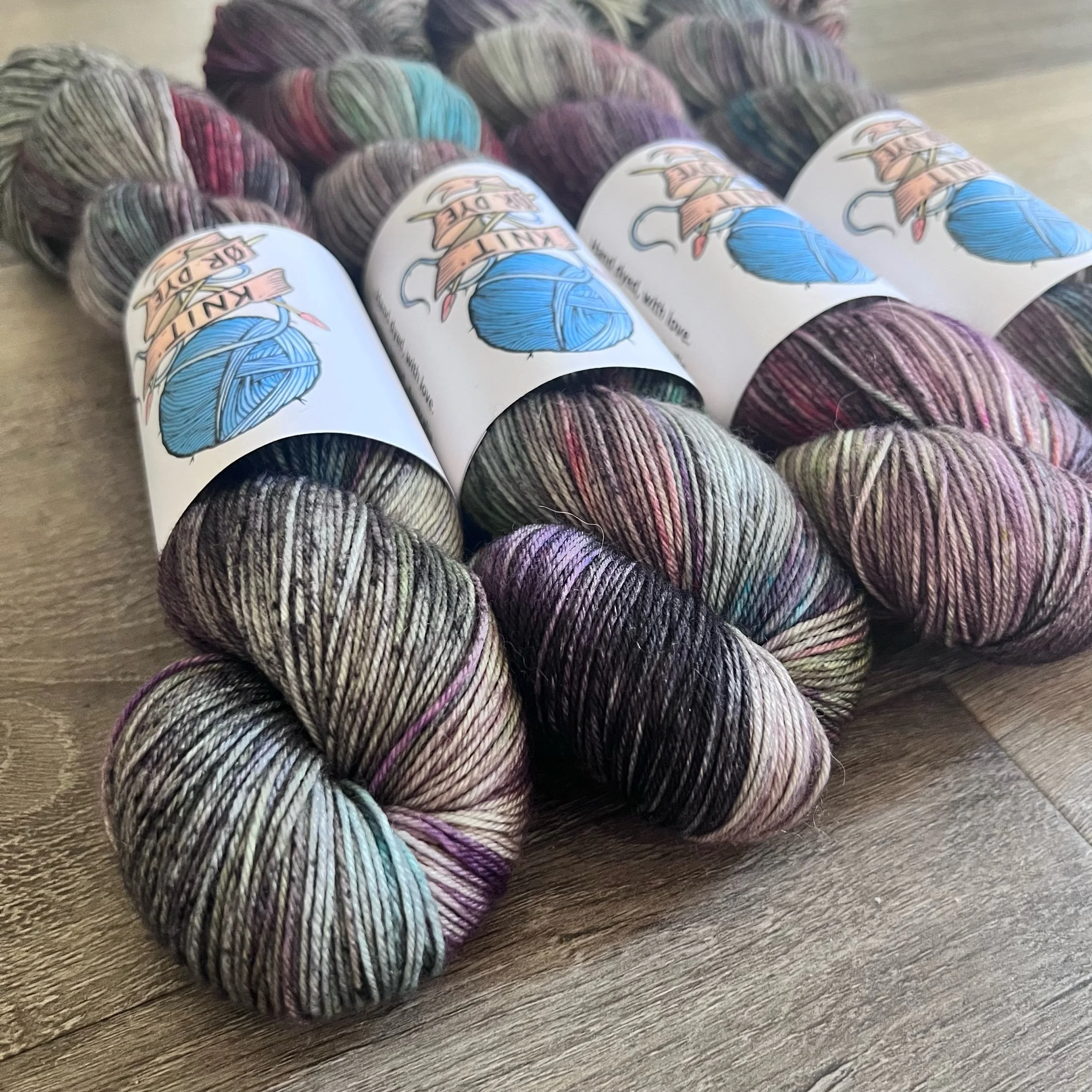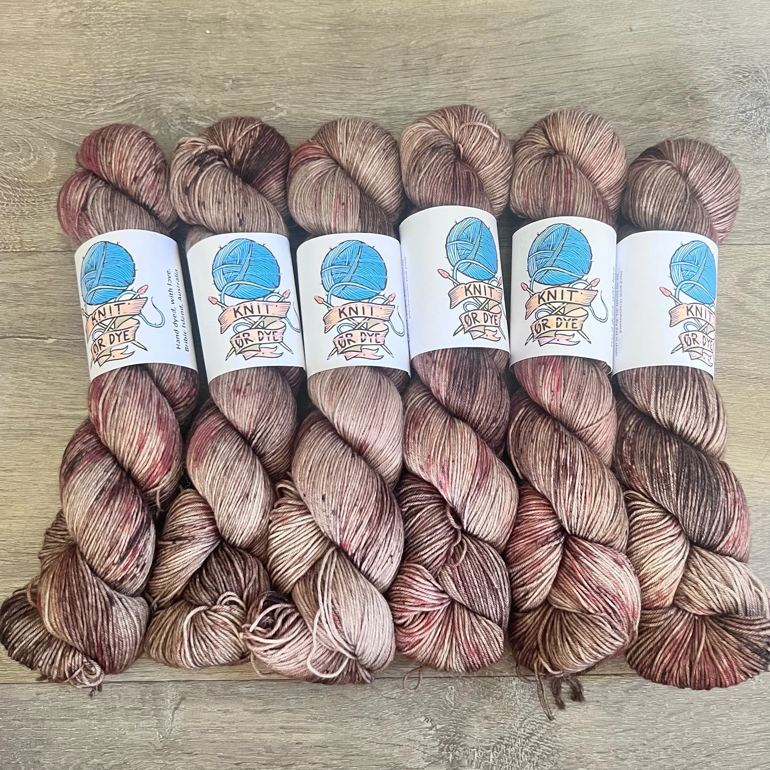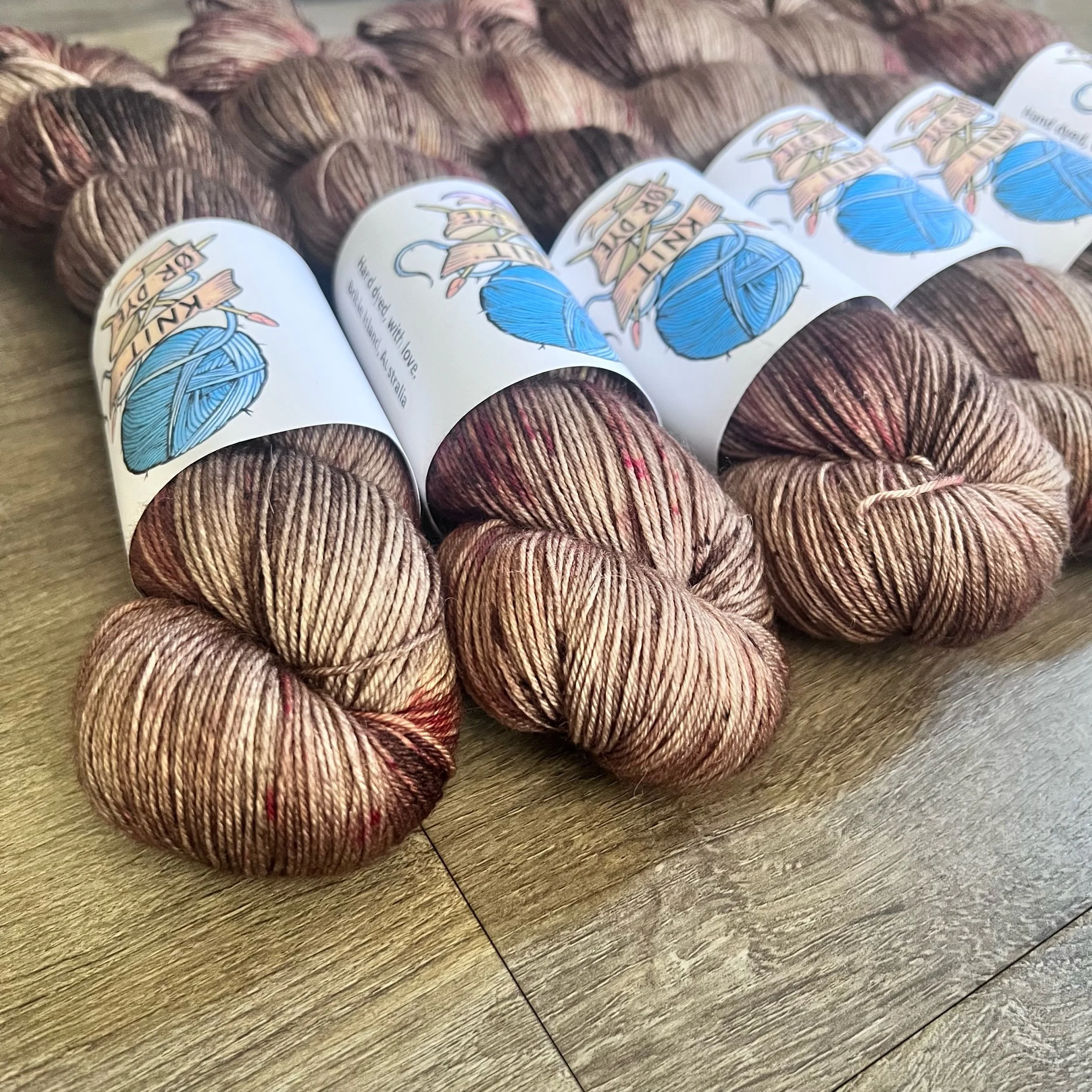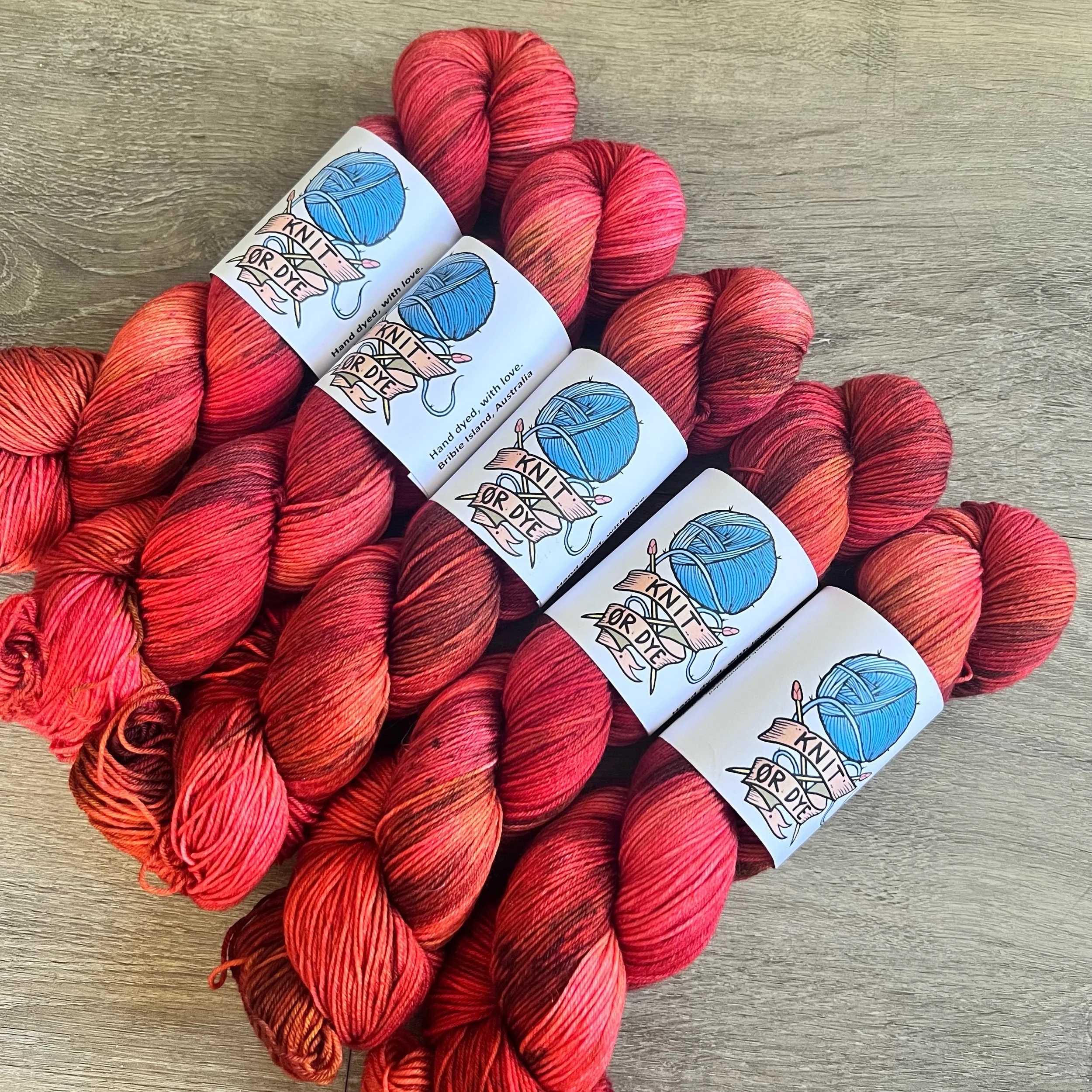 Soft, 75% superwash merino wool, 25% nylon sock yarn. Each skein is hand dyed with love ❤️. Skeins are ~ 100g, approx 425m. Fingering weight, or 4 ply (Australian weight).