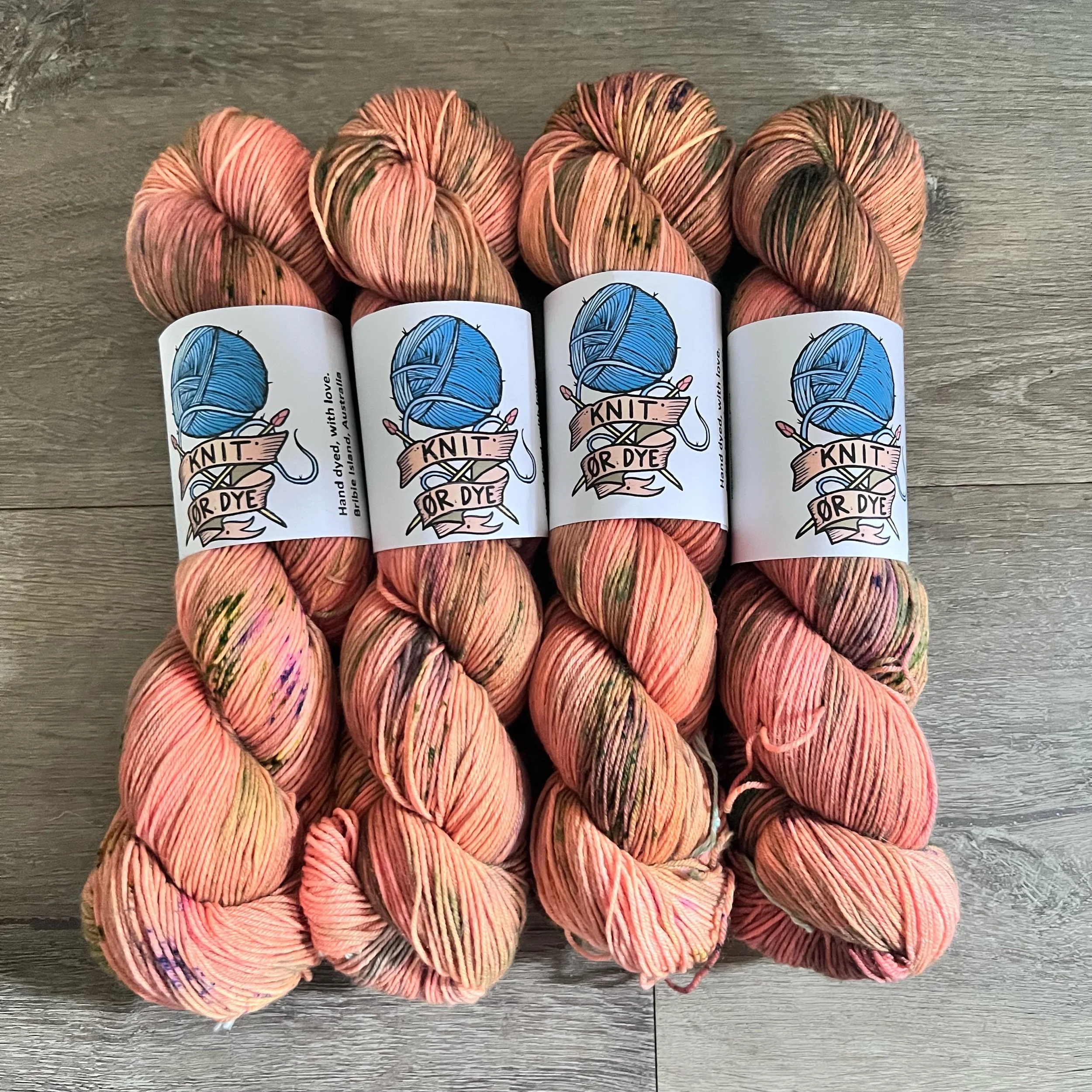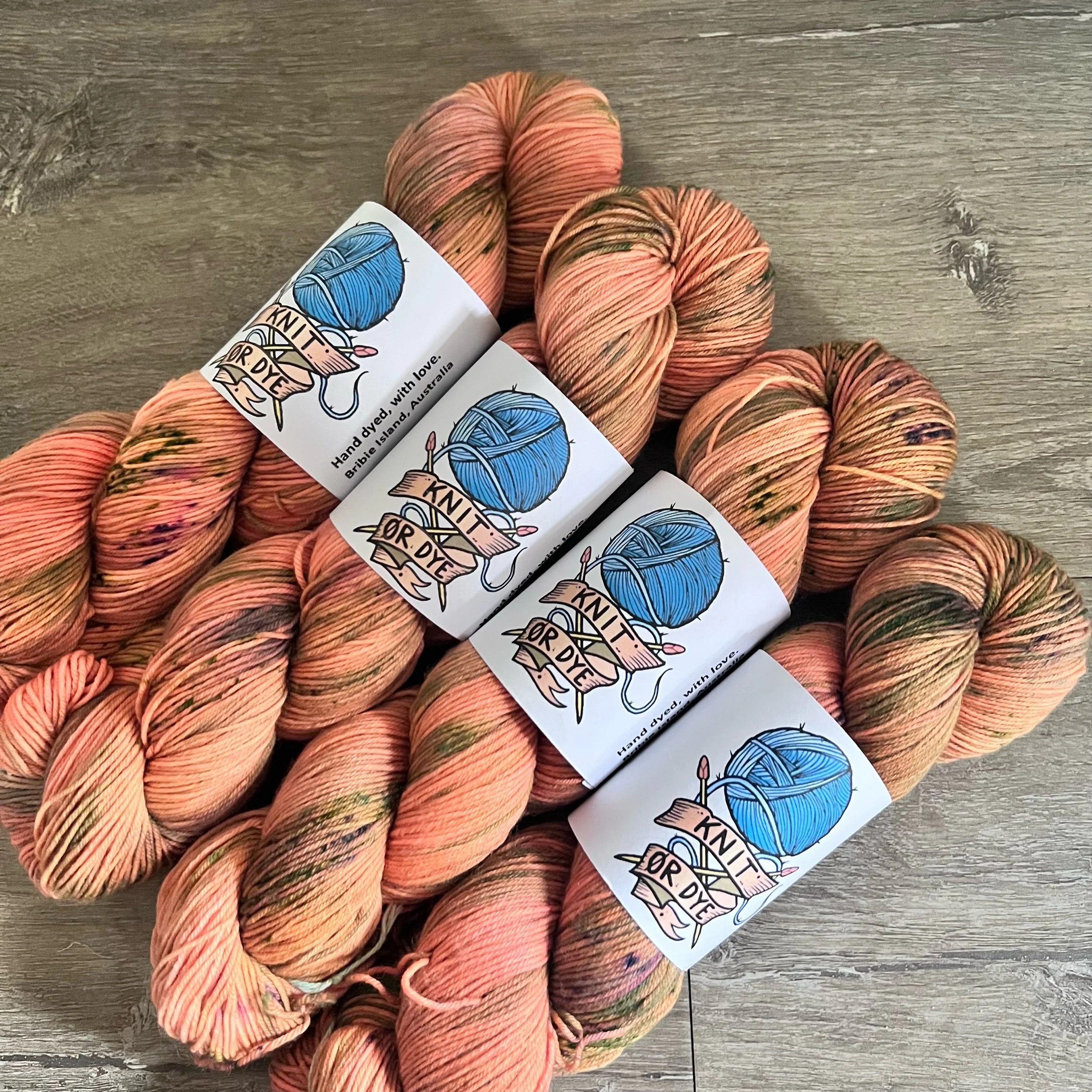 Soft, 75% superwash merino wool, 25% nylon sock yarn. Each skein is hand dyed with love ❤️. Skeins are ~ 100g, approx 425m. Fingering weight, or 4 ply (Australian weight).