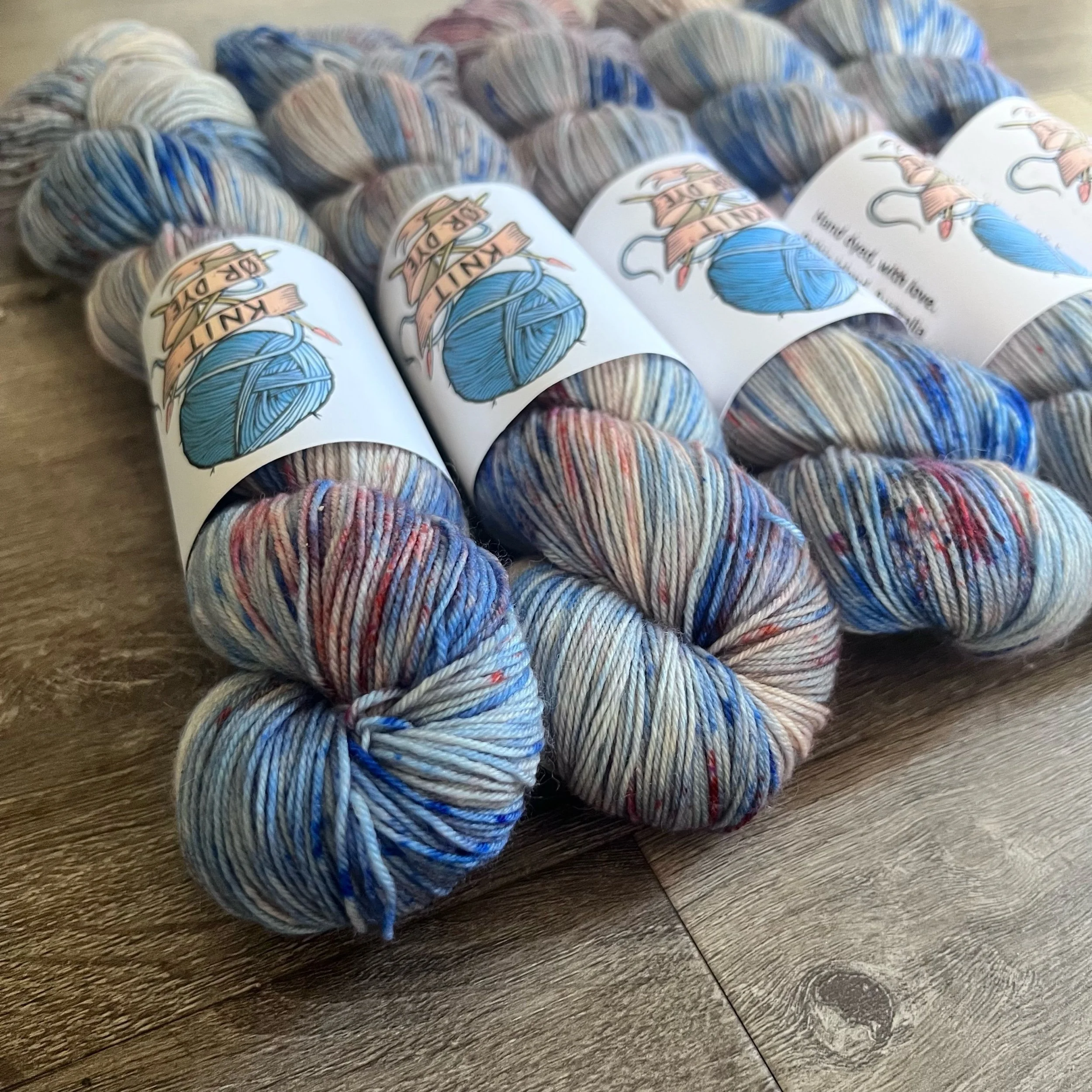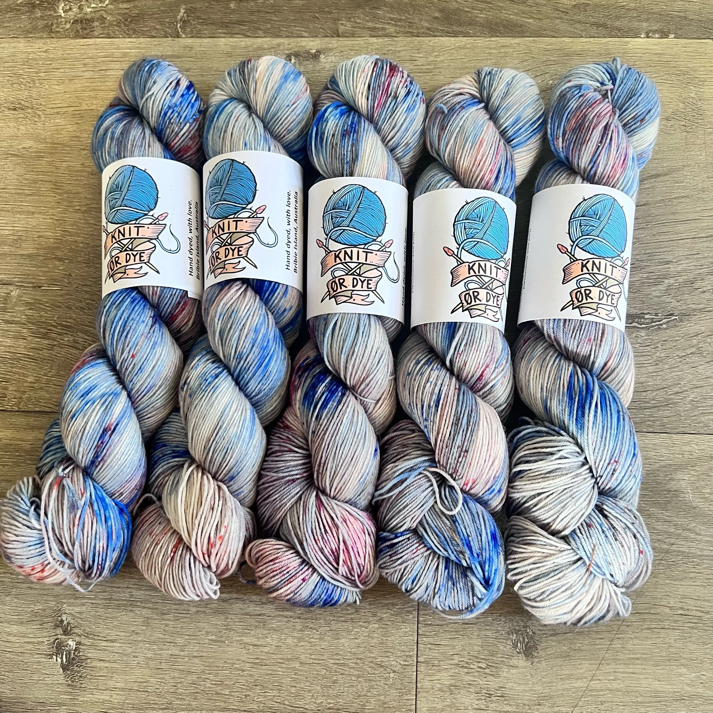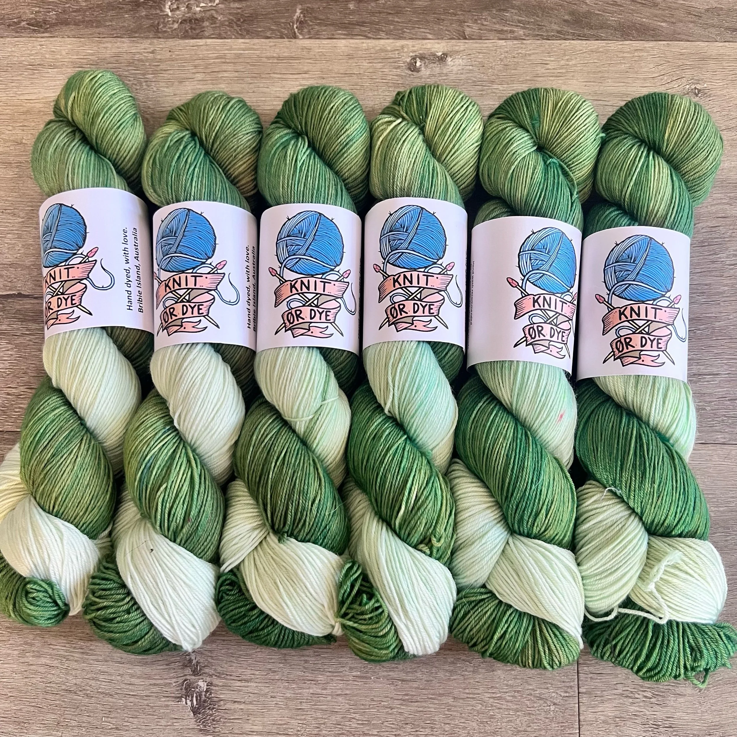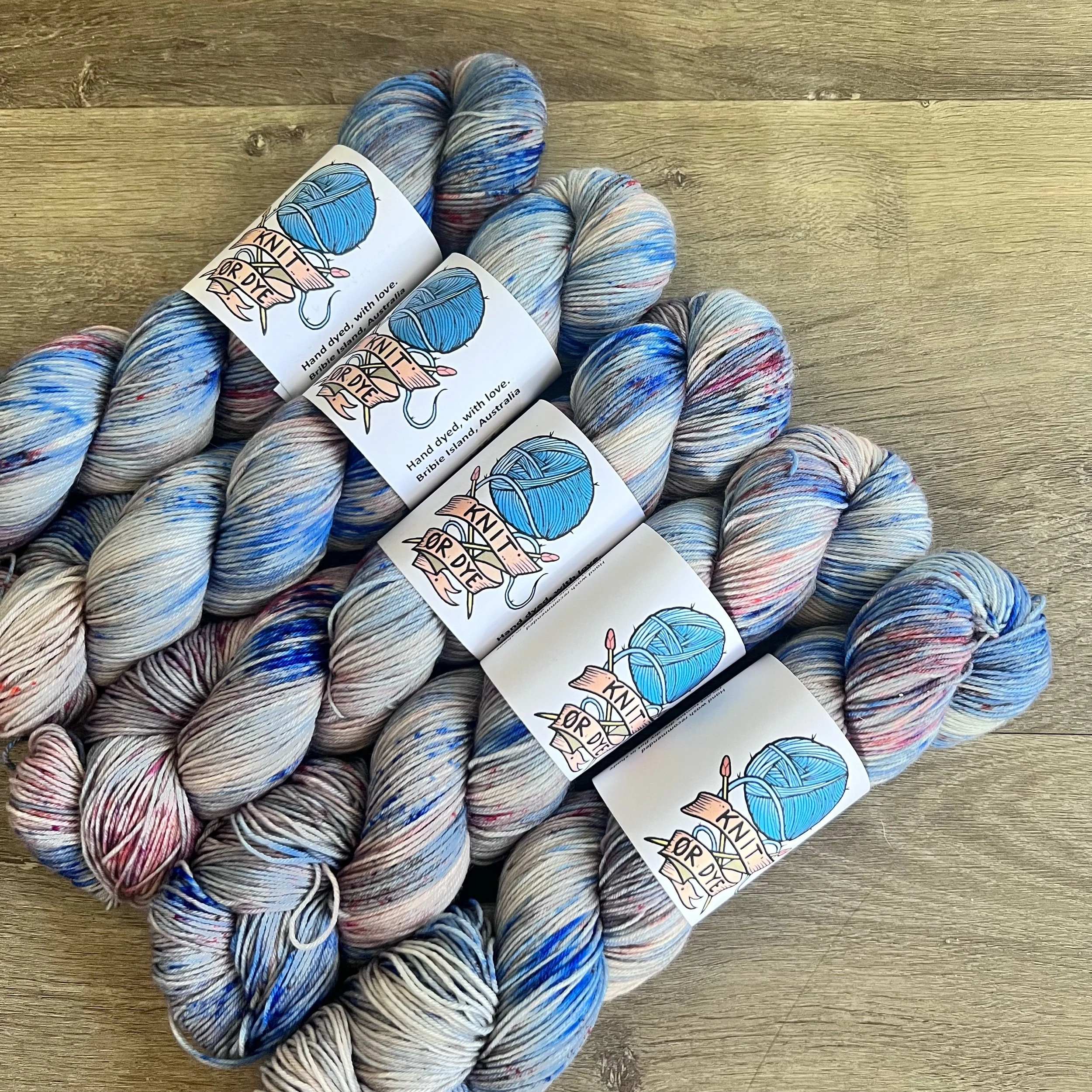Soft, 75% superwash merino wool, 25% nylon sock yarn. Each skein is hand dyed with love ❤️. Skeins are ~ 100g, approx 425m. Fingering weight, or 4 ply (Australian weight).